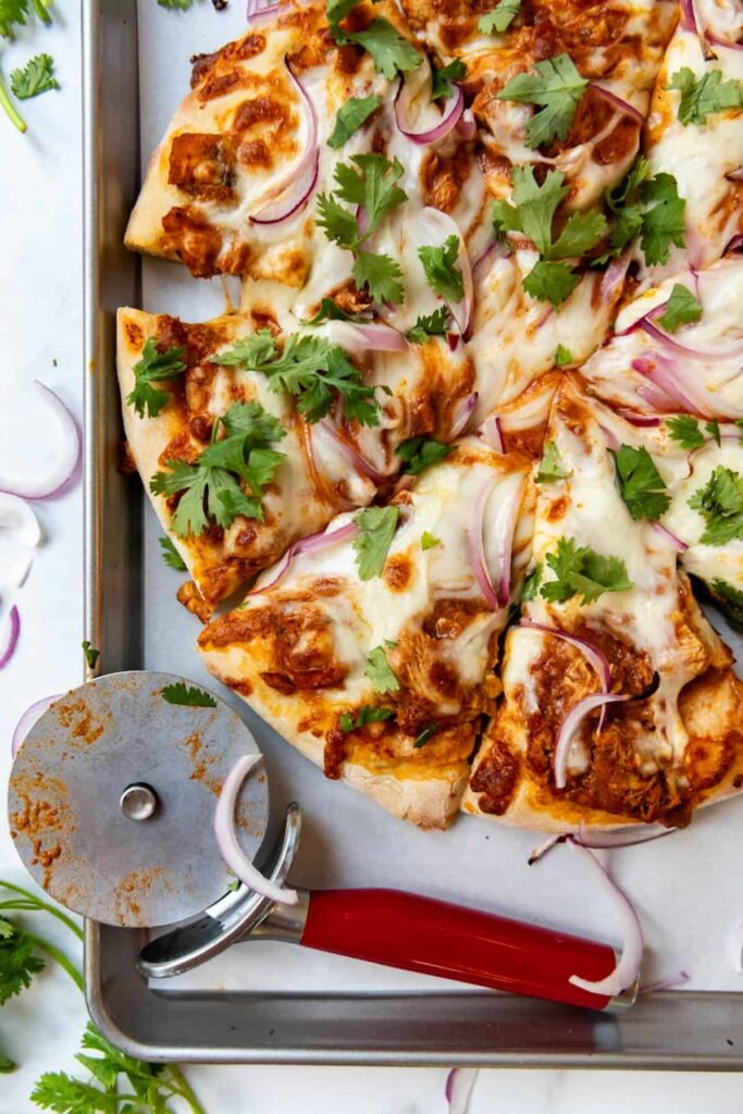 That sauce is bold and distinct enough to stand in for the usual pizza marinara, and the chicken, which is usually cooked in a tandoor or a grill, stays juicy and tender even after a quick trip through a super-hot oven. The real genius move here, though, is the crust. Using naan as your pizza base is a game-changer, and I am never going back. You can find store-bought naan in pretty much any grocery store, and it behaves like it was specifically designed for this job.